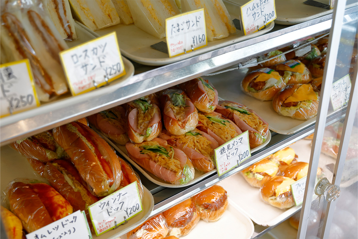 食パンやクリームパンといった不動の人気を誇る大定番はもちろん、個性的なパンも数多い。たとえば、焼印が印象的な“松陰あんぱん”。中に入っているのは普通のあんこではなく、生クリームやバターを加えて仕立てた黄身あんだ。チョココロネならぬ“キャラメルコロネ”、まるでプリンをそのまま食べているかのようなおいしさの“プリンパン”。惣菜パンにいたっては、卵やトマト、ハムとともに茎わかめサラダをはさんだ“スペシャルサンド”や、コッペパンになんとメンマをたっぷりのせた“穂先メンマドッグ”まで。思わず「なにこれ?」と手にとってしまう変わり種があるのも楽しい。小さな子どもから高齢者まで、老若男女問わず多くのファンに愛される所以である。