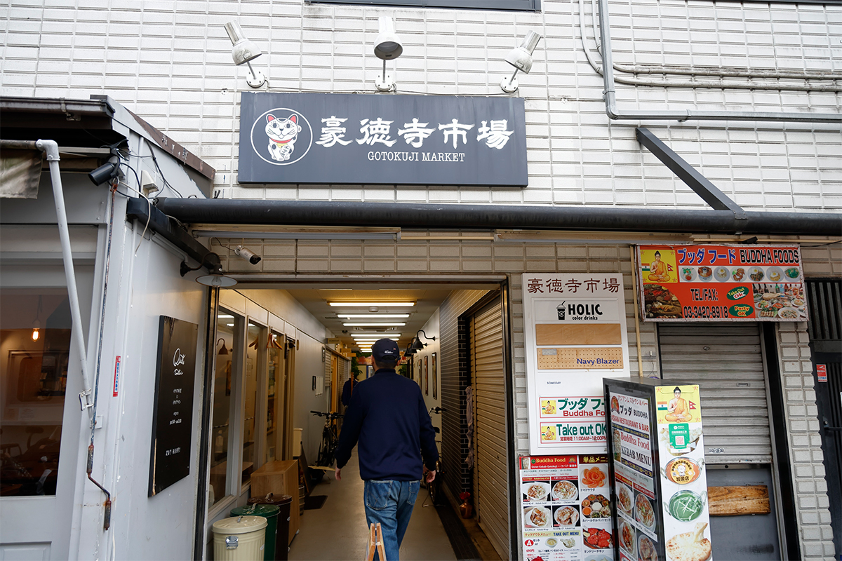 細い路地にバラエティに富んだ商店が並ぶ豪徳寺駅前。近年では、名刹豪徳寺の招き猫目当てに国内外から多くの観光客が集うこのエリアで、駅前から「豪徳寺商店街」を南へほどなく進むと姿を現すのが、小さなアーケード型の商店街「豪徳寺市場」だ。