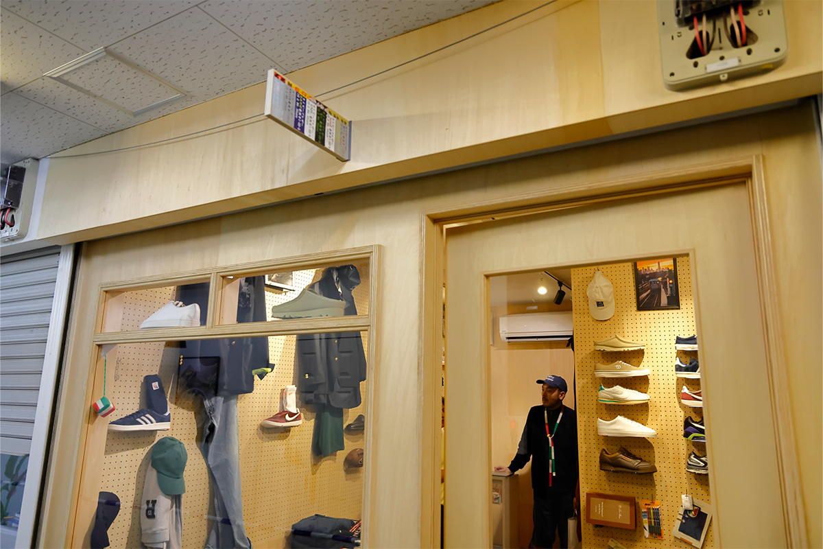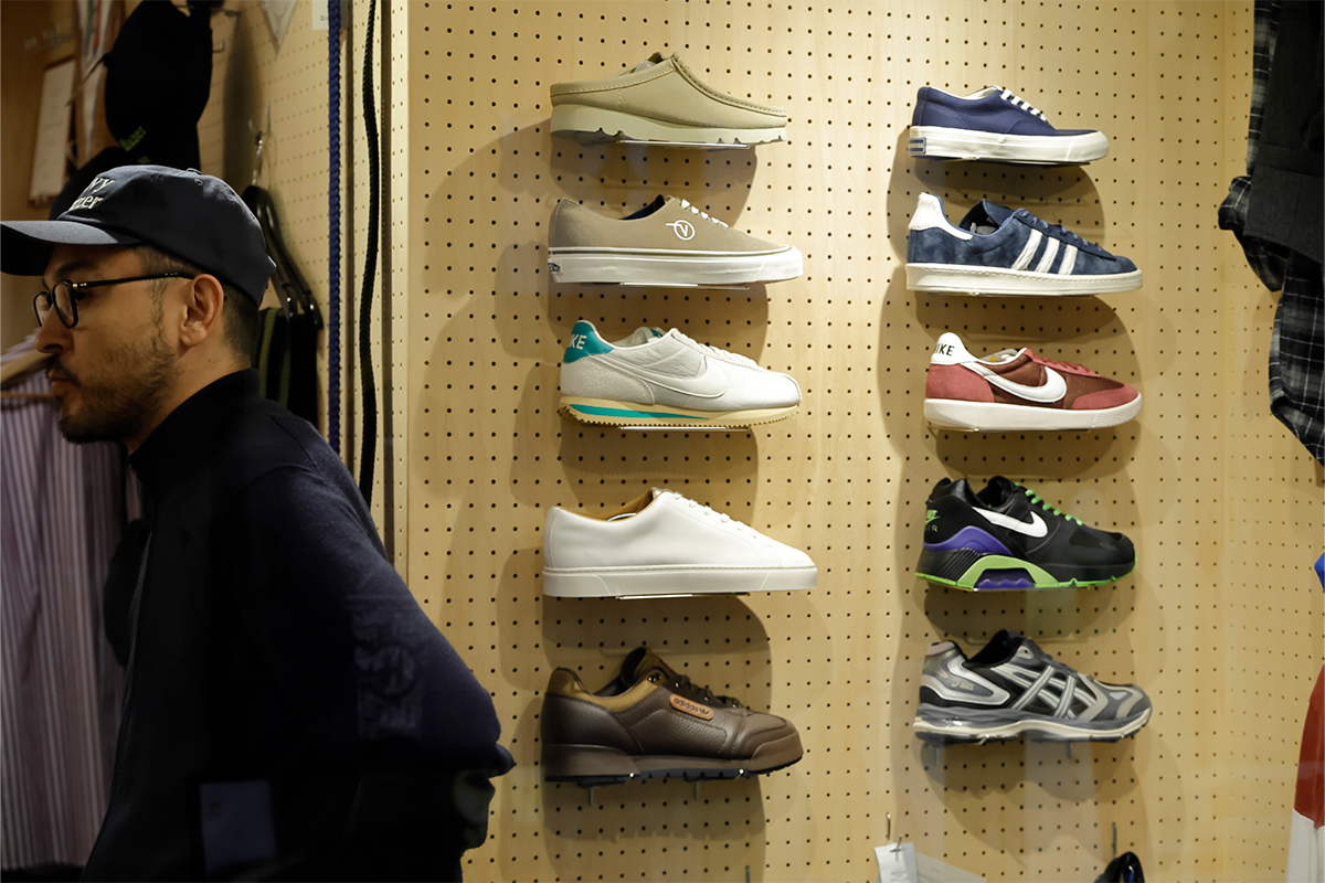 優しげな木目調の外装に、教室のような立札式の看板。大判のガラス面の向こうには、木目のある有孔ボードに、さまざまにコーディネイトされた洋服や、スニーカー、帽子やネクタイなどが、ひしめきあうようにディスプレイされている。