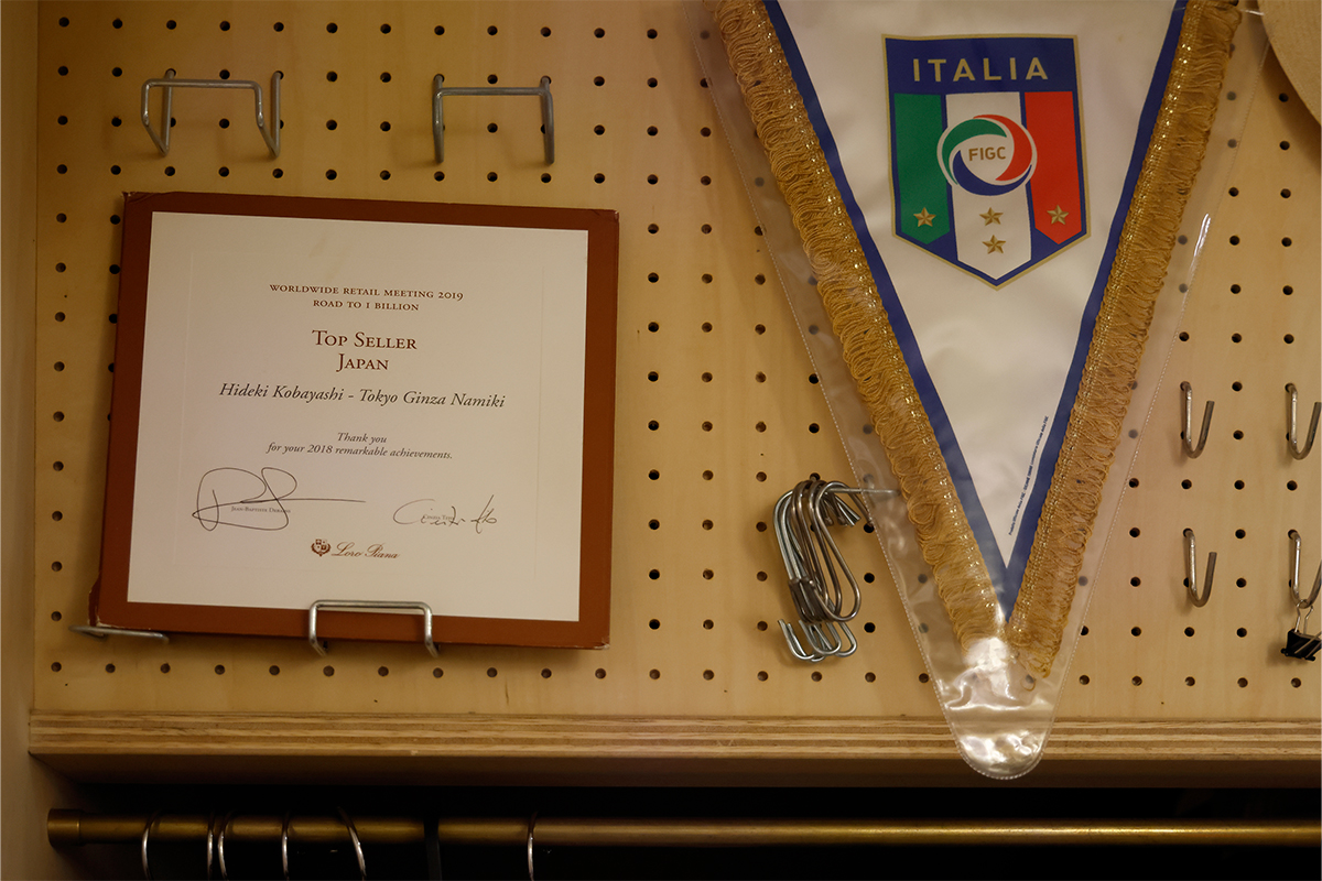 壁には、かつて店舗スタッフを務めていた際に受賞したと思しき「TOP SELLER JAPAN」としての表彰状が掛けられている。小林さんの丁寧な話ぶりからは、内に秘められたスタイルへの思いが、ほんの1時間程度の滞在だが、存分に感じられてくる。