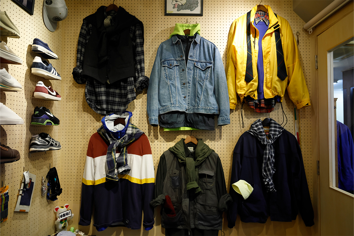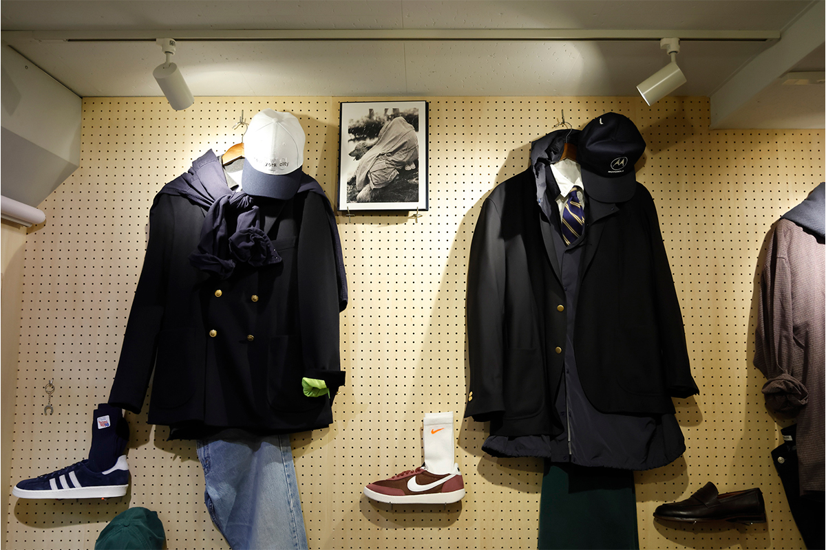 さらに面白いのは、コーディネイトのディスプレイだ。NYのスニーカーショップから着想を得たという有孔ボードを活用し、なんともスタイリッシュな空間を演出している。