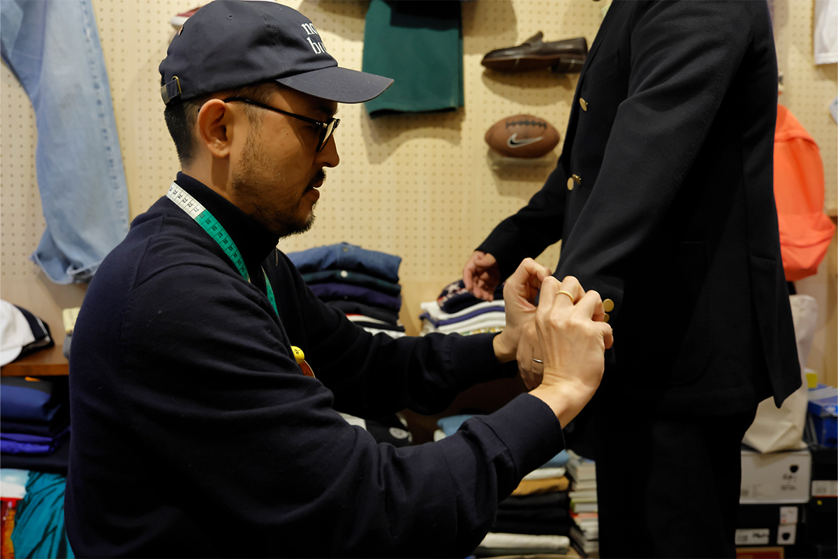 一丁目一番地であるお店の顔「ネイビーブレザー」は、採寸してサイズ調整をする、いわゆる“イージーオーダー”の形式をとっている点も、ファッションにこだわりをもつ人ならば、粋に感じることだろう。