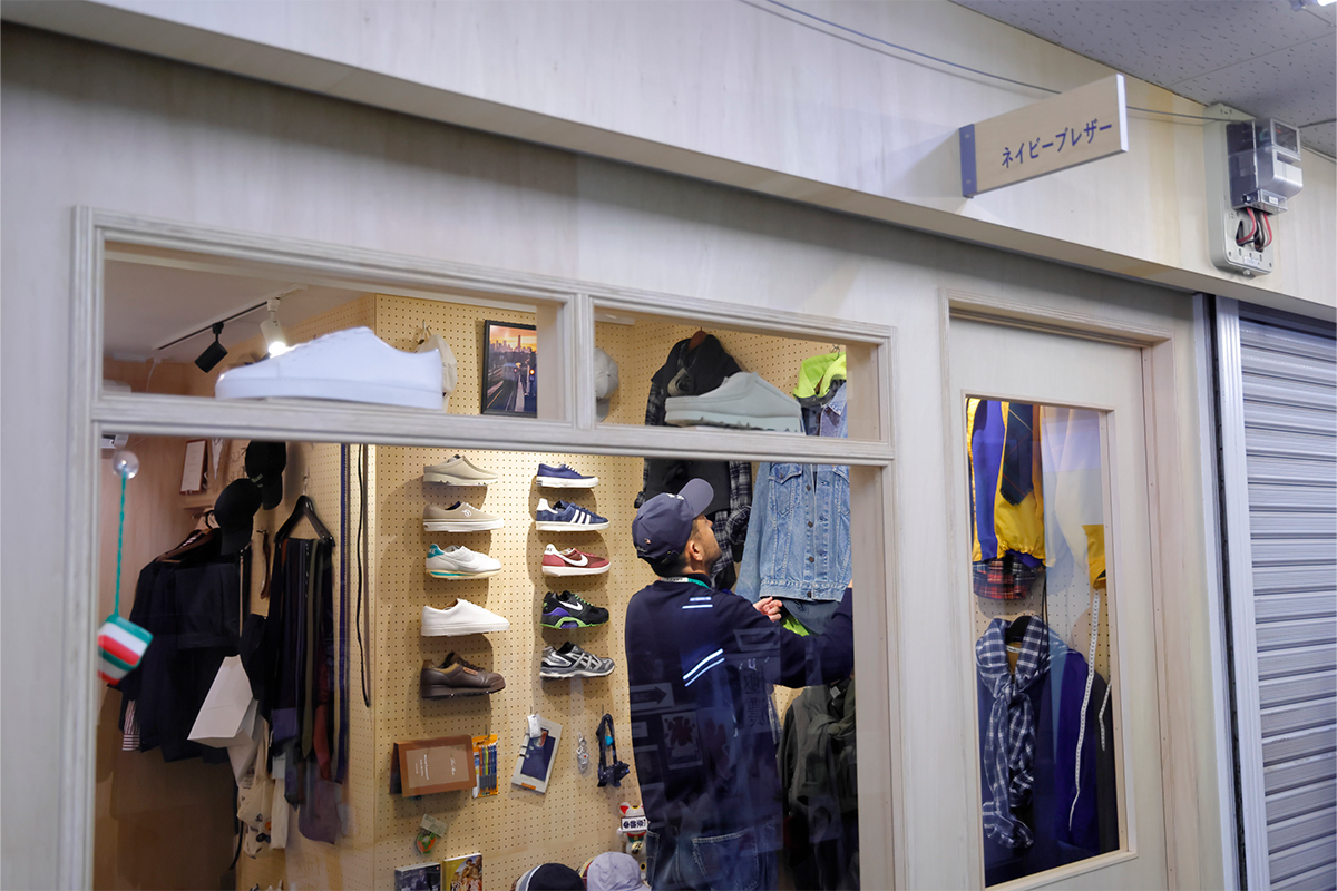 現在は改築されており、当代風の店舗が入っているが、もともとは鮮魚店「魚角」が始めたという100年以上の歴史をもつ市場なのだとか。その雑多な雰囲気にワクワクしながら一歩足を踏み入れると、その奥にスタイリッシュな『ネイビーブレザーストア豪徳寺』が店舗を構えている。